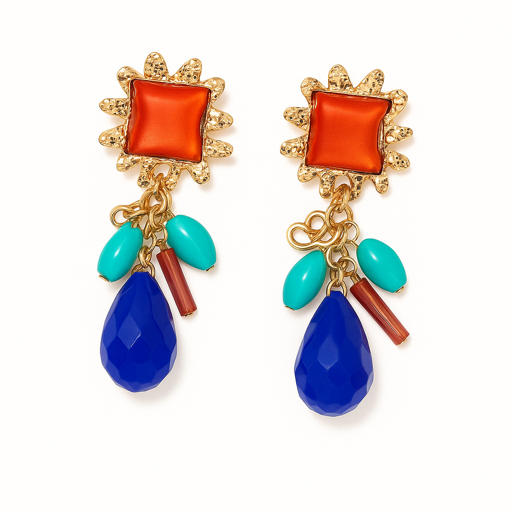 Elevate your look with Caribbean Carnival, featuring a stunning sunburst top and vibrant cobalt and aqua gems. Make a statement with these bold and glamorous drops, perfect for adding a touch of tropical fun to any outfit. Get ready to turn heads and bring the party with you wherever you go!