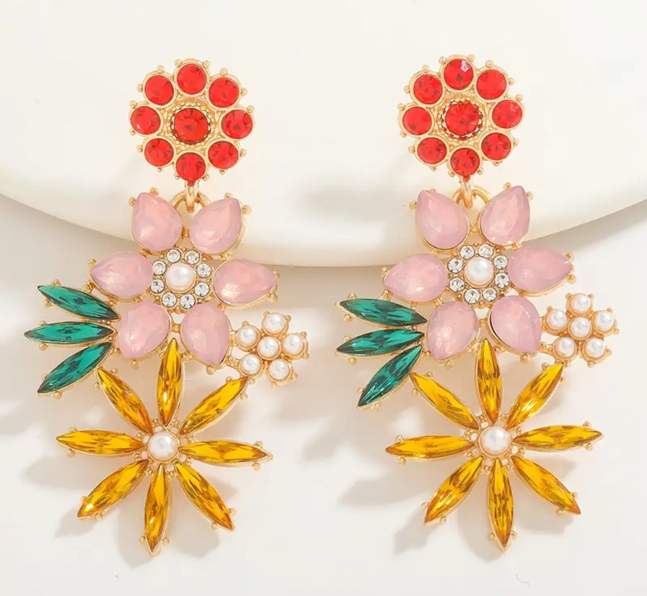 Turn heads and lift spirits with Garden Jubilee—a vibrant floral celebration in earring form. Featuring clusters of ruby red, blush pink petals, sparkling pearls, and golden sunshine florals, these bold beauties bring the energy of a spring garden in full bloom. Lightweight yet impactful, they’re perfect for festivals, brunches, and any day you’re feeling extra.