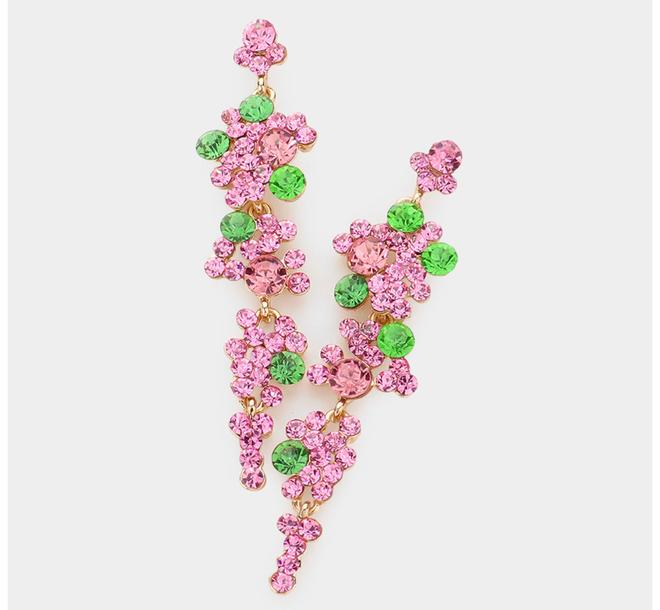 These earrings, called Margaret, are made with pink and green bubbly stones. The stones come together to create a colorful, eye-catching design that will add a fun, stylish touch to any outfit.