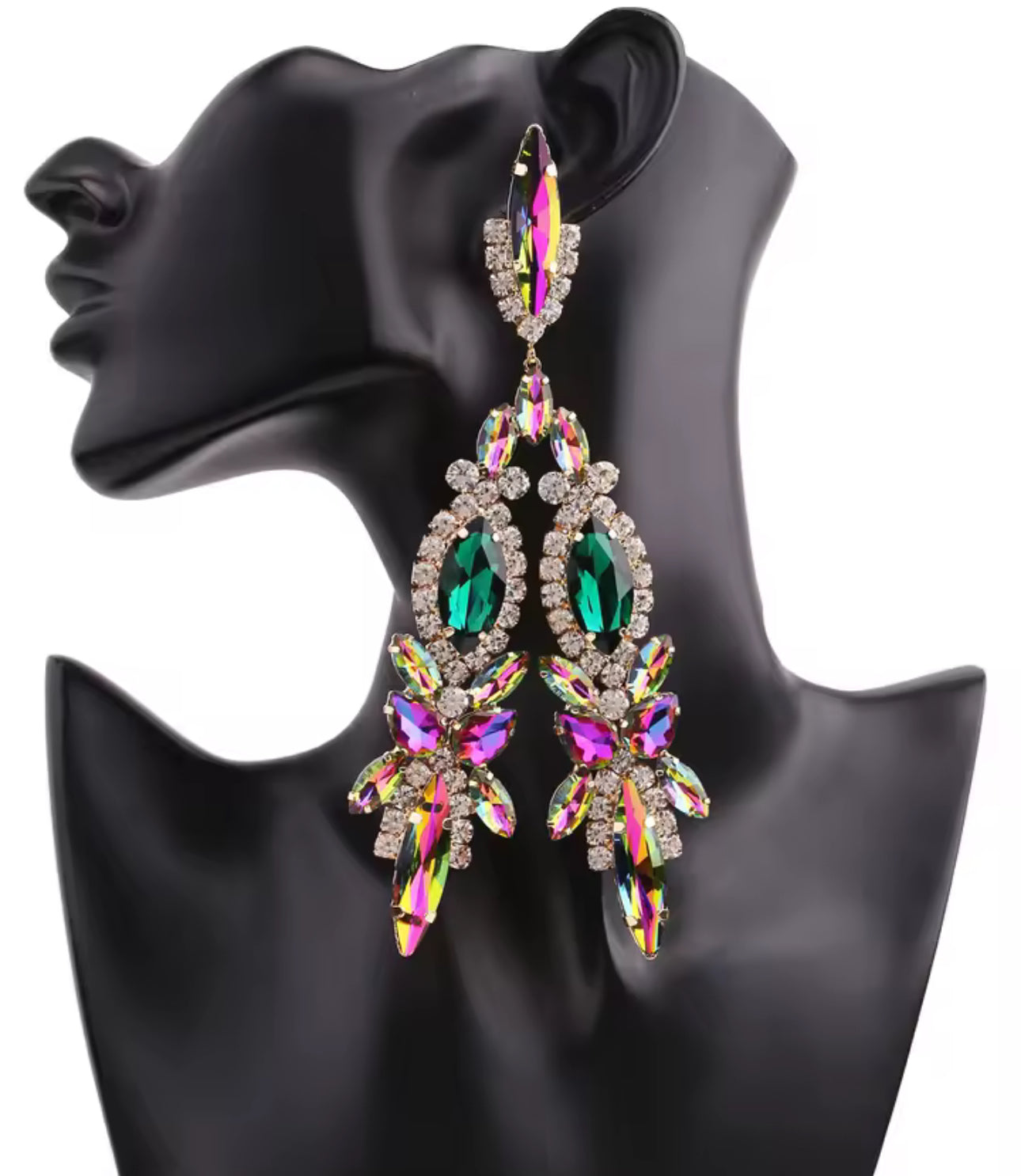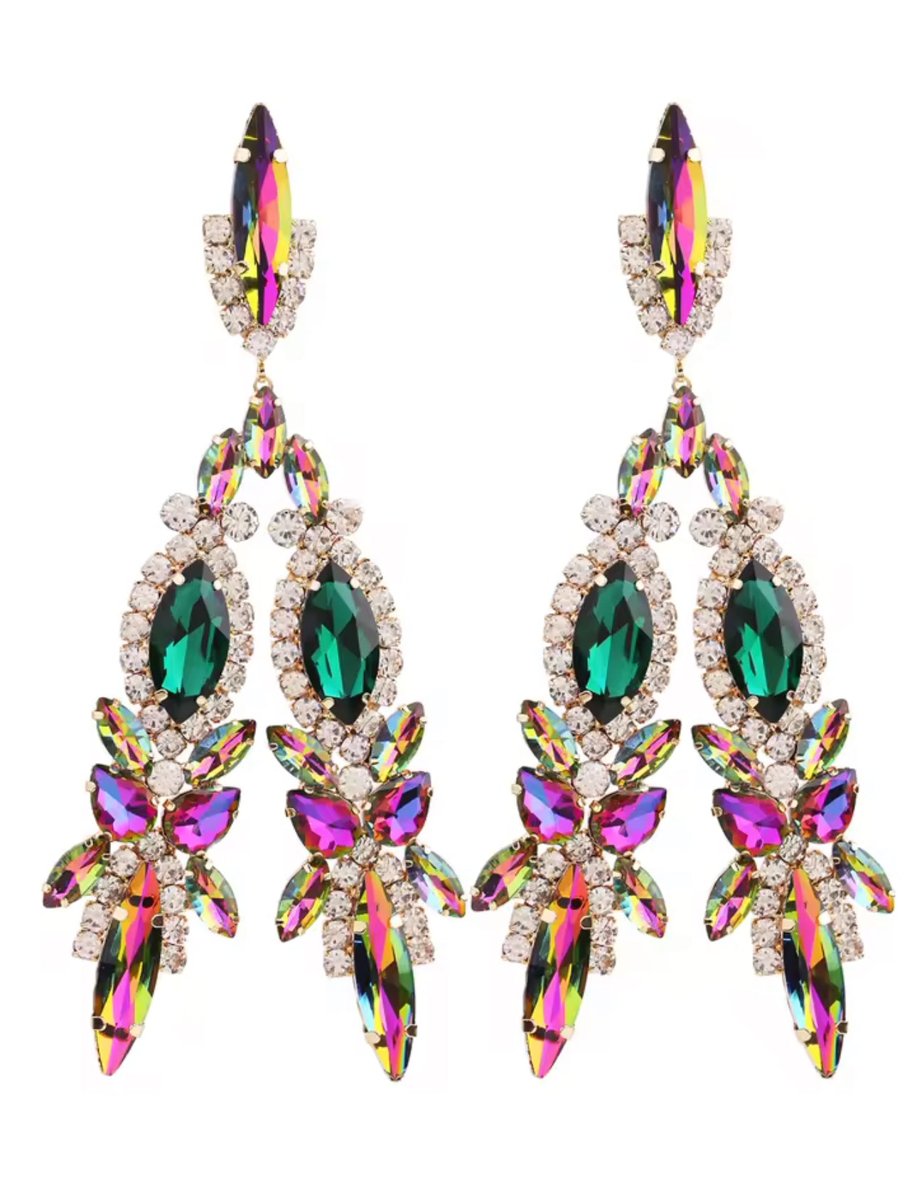 Step into the spotlight with Prism Empress crystal drops. These statement earrings feature emerald-green jewels and iridescent prism stones, making them perfect for the woman who commands attention and owns every room she enters. Elevate your presence and style with Prism Empress.