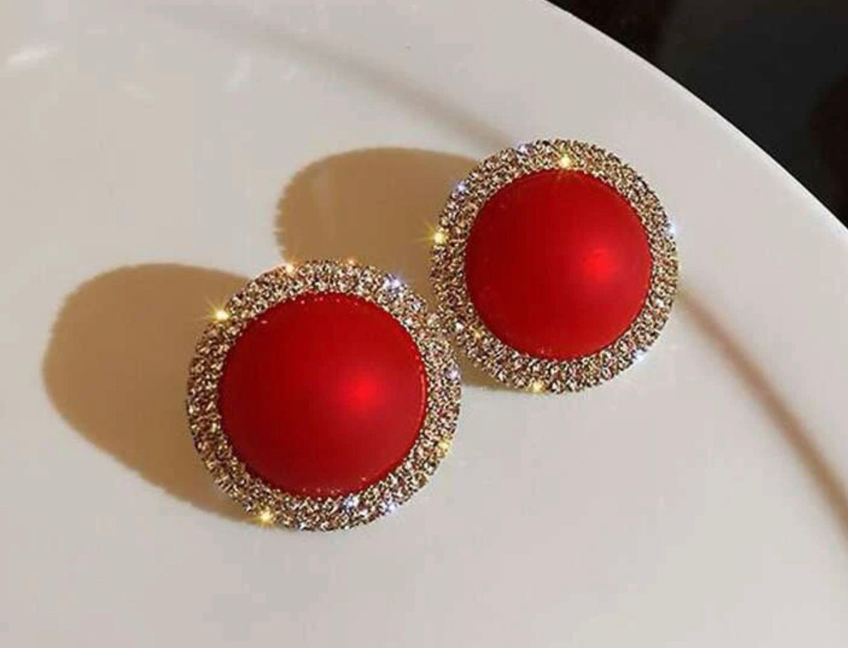 Make a statement with Susan, red round stud earrings trimmed with a touch of sparkle from small diamonds. With a luxurious feel and classic look, these earrings are perfect for elevating any outfit.